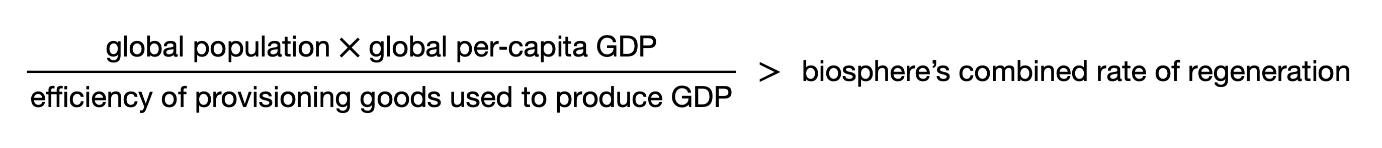 Dasgupta proceeds to outline the sheer decline the natural world has experienced over the last two centuries, like a quarter of our tropical forests facing our collective chainsaw since the first Convention on Biological Diversity in Rio, back in 1992. This is put down to a poorly weighted Impact Inequality — the idea that total ecological overreach can be measured by:
